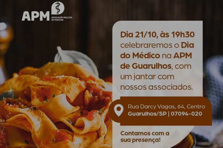 Dia 21/10 às 19h30, vamos realizar um jantar para comemorar o Dia do Médico na APM de Guarulhos